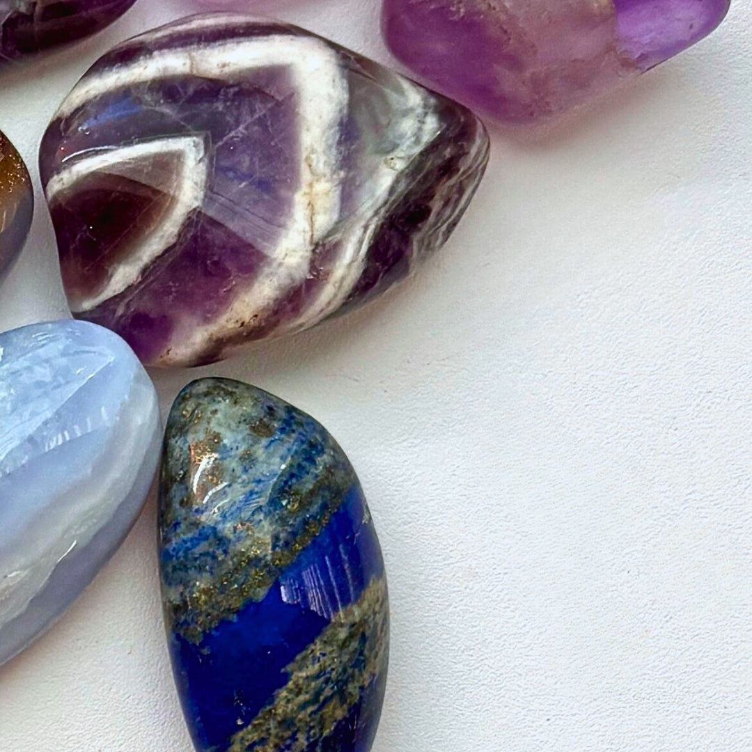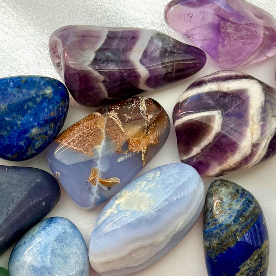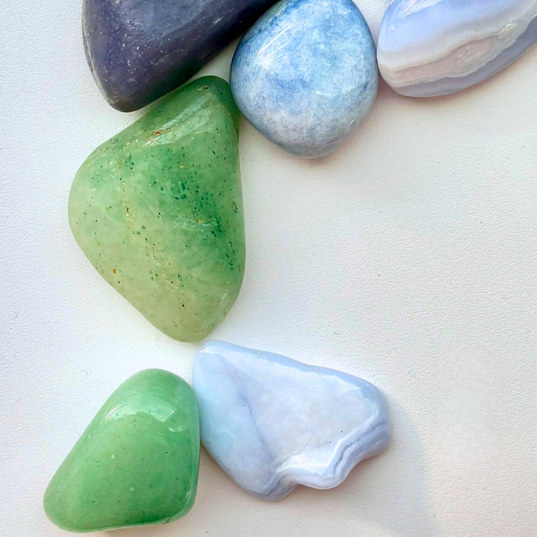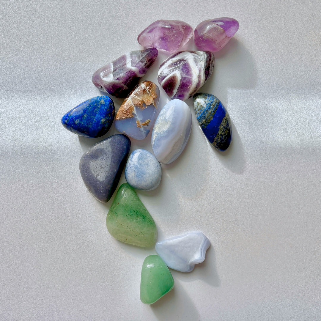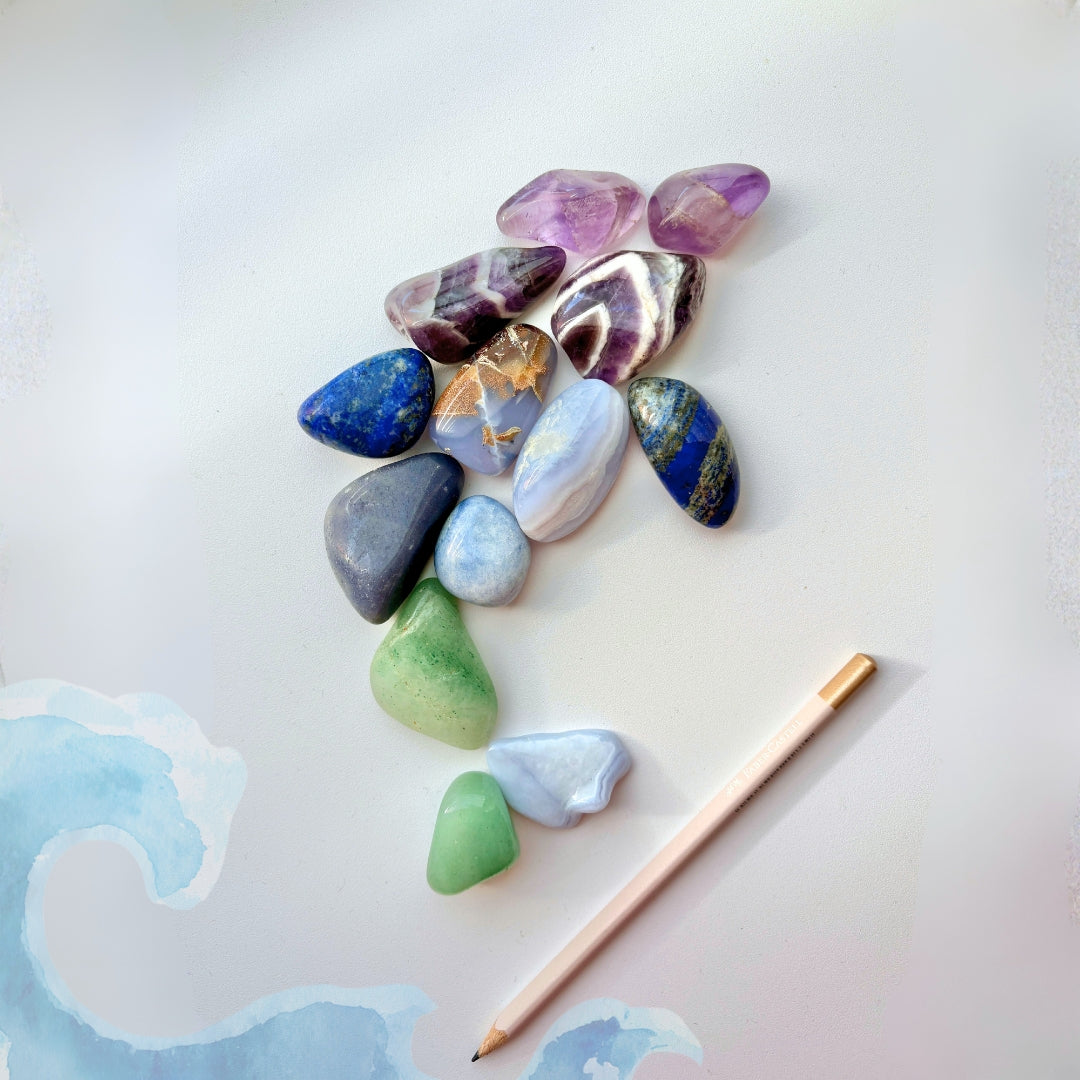 (tarp jų – mėlynasis chalcedonas, ametistai, lapis lazuris, aventurinai, agatai ir kiti švelnūs, vandens įkvėpti kristalai) Tikslūs kristalų aprašymai bus atsiųsti kartu su šiuo rinkiniu.