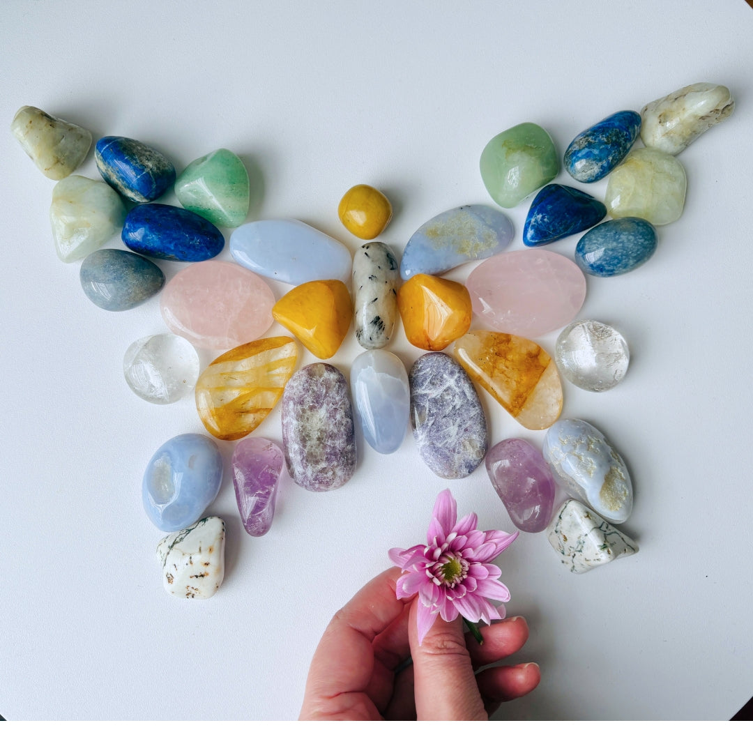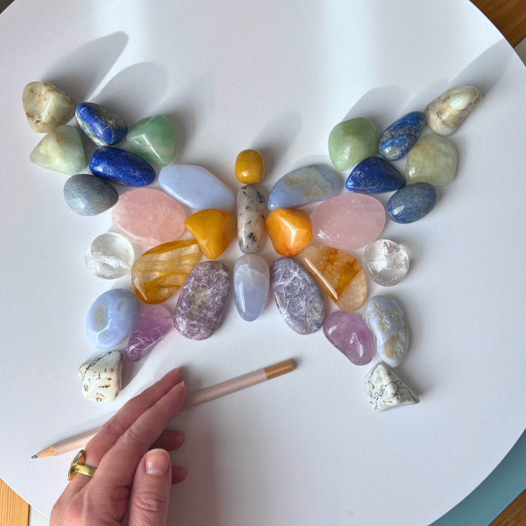 Šis išskirtinis 33 natūralių kristalų rinkinys „Drugelis“ sukurtas tiems, kurie nori pajusti subtilų grožio, harmonijos ir energijos balansą. Kiekvienas kristalas buvo kruopščiai atrinktas rankomis, siekiant išlaikyti formų ir spalvų simetriją bei estetinį vientisumą – nuo švelnių rožinio kvarco tonų iki gilios mėlynos Lapis Lazurio ramybės ir švytinčio geltono kvarco šilumos.