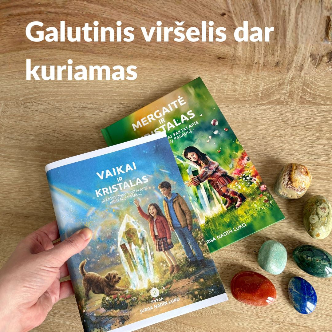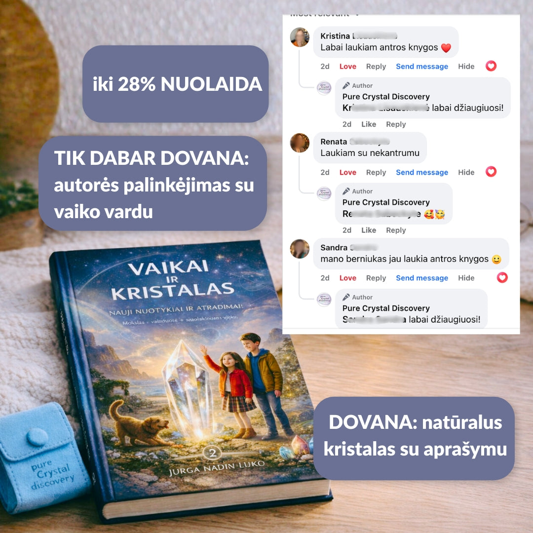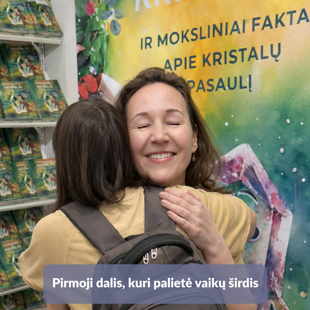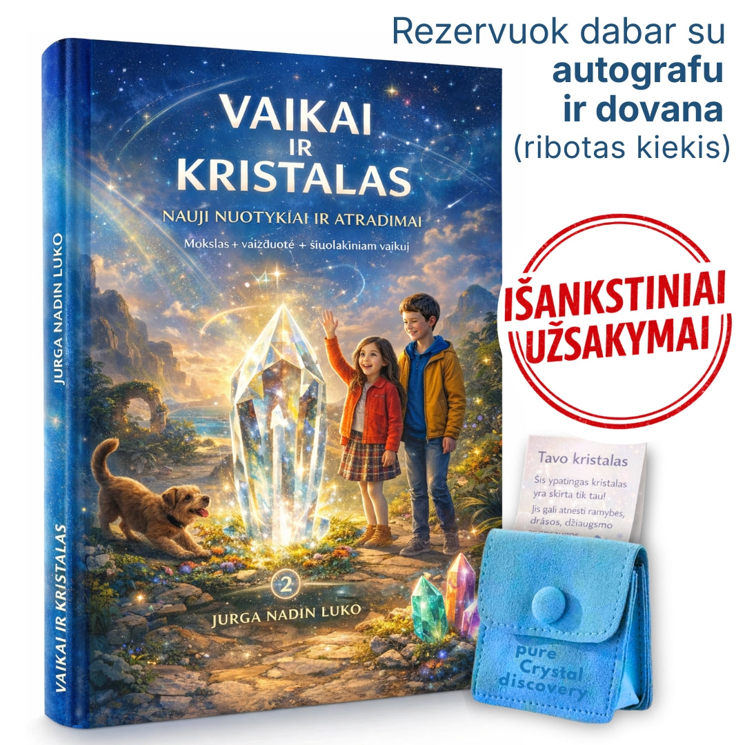 Tai asmeniškai jūsų vaikui skirta istorija su įrašytu vardu, autorės autografu ir natūraliu kristalu su aprašymu.